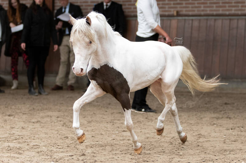 Shadow is een pareltje om te zien met zijn lange hals, chique hoofdje en felblauwe ogen. Hij beweegt zeer lichtvoetig en heeft een sterke achterhand. In 2025 hebben wij hem voorgesteld op de NMPRS hengstenkeuring. Hier behaalde hij een 1ste premie, werd daarmee goedgekeurd voor 3 jaar en verdiende het STER predikaat.